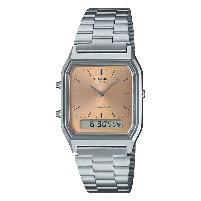 Silver-rosegold watch Casio for women and men with digital dial. It's thick, retro and elegant. Its silver strap from stainless steel is connected to the thin case from resin. Band fastening is on the flip clasp. This watch with quartz movement is for sure quality fashion accessary. Its water resistance is 3 ATM. It resists the rain and hand washing.