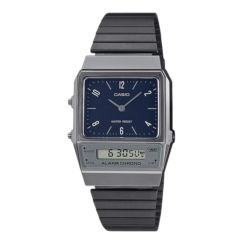 Black-blue watch Casio for women and men with digital dial. It's thick and retro. Its black strap from stainless steel is connected to the thin case from resin. Band fastening is on the flip clasp. This watch with quartz movement is for sure quality fashion accessary. Its water resistance is 3 ATM. It resists the rain and hand washing.