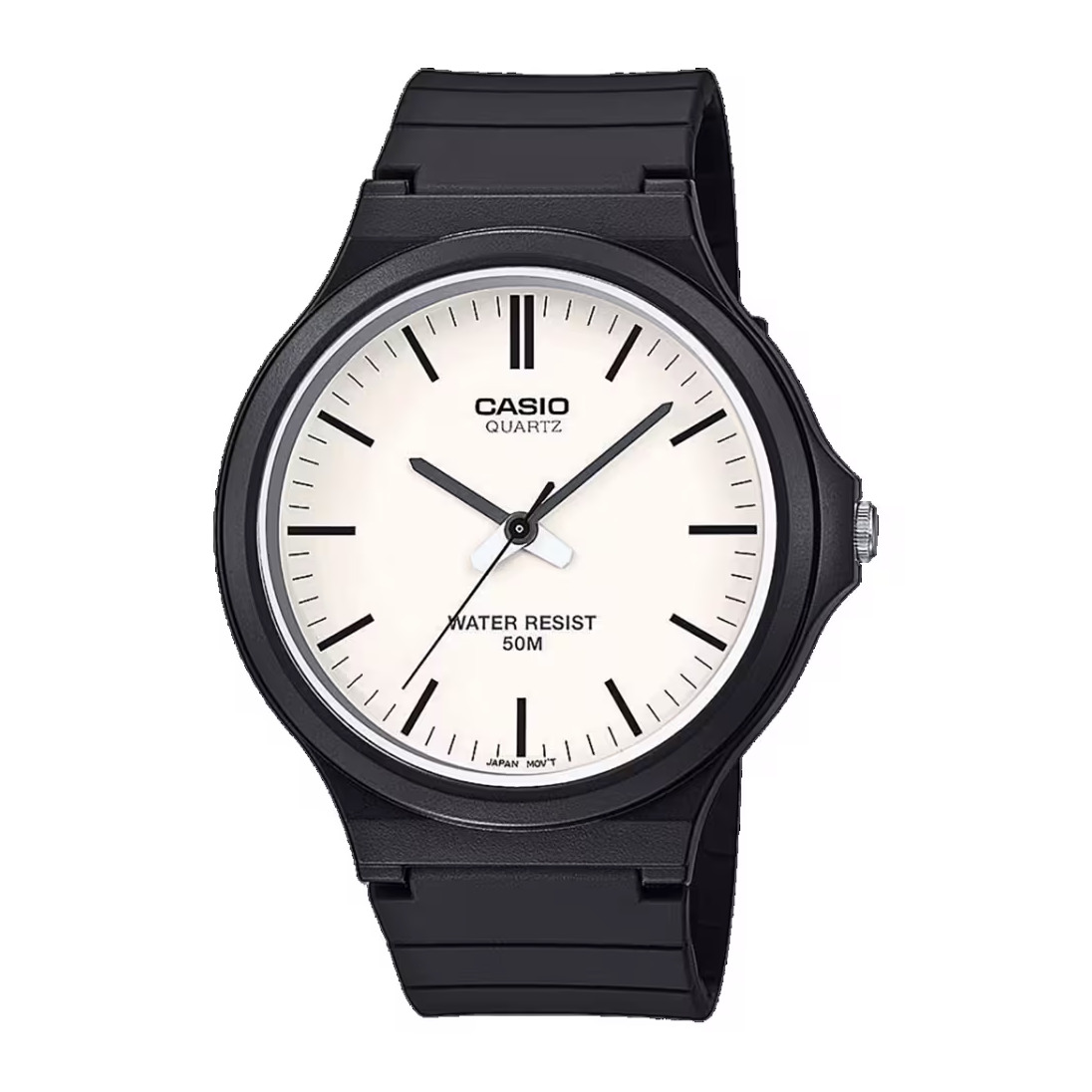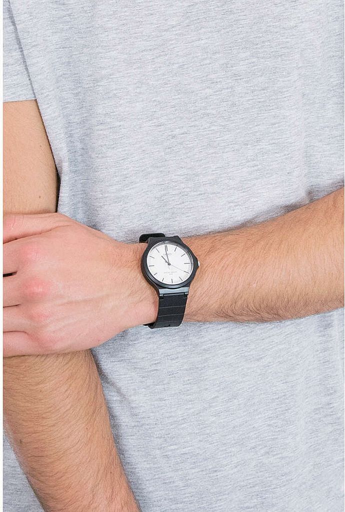 Black-whites men's watch Casio. It's big, minimalist and sports. Its black strap from resin is connected to the case from resin. Band fastening is on the buckle. Thanks to its simplicity you can easily wear it with your favourite style. Its waterproof is 5 ATM. You can have a bath or shower with it.